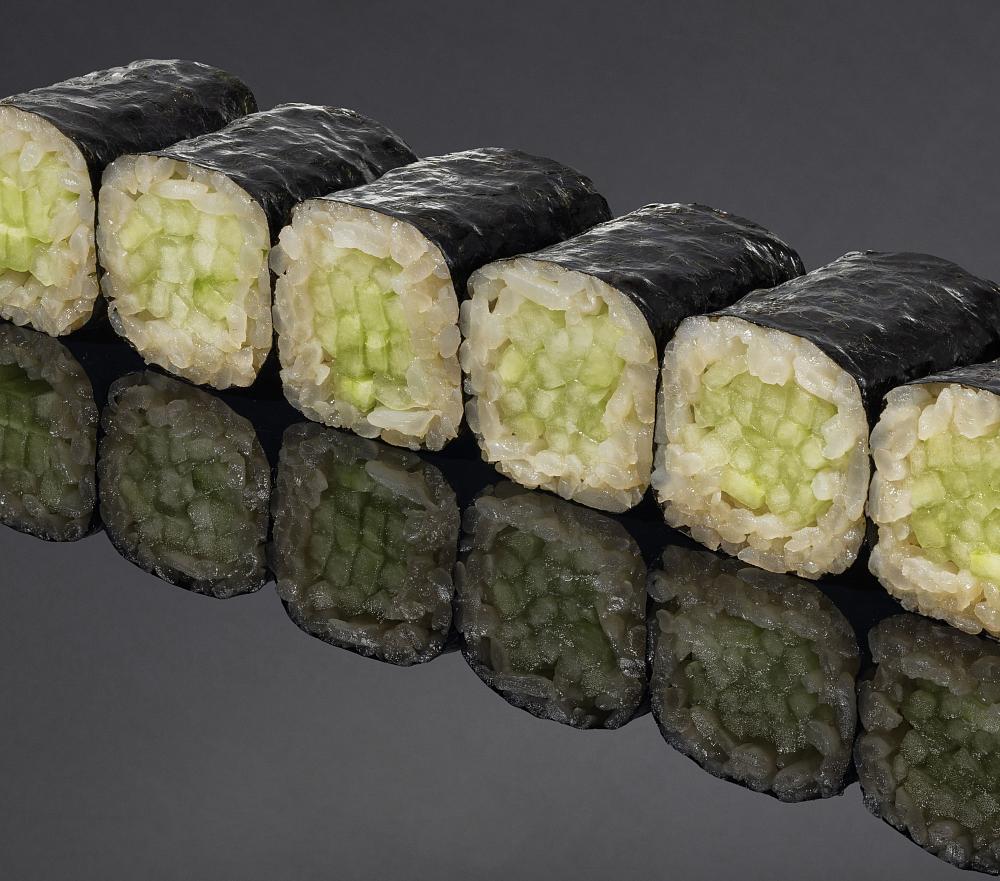 рис для суши, угорь копченый, огурец, лук-сибулет, маменори с кунжутом, соус спайси