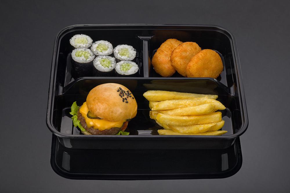 Мини-чизбургер, ролл с огурцом, картофель фри, наггетсы из цыпленка с сыром, кетчуп, соус соевый + яблочный сок (250 мл.)