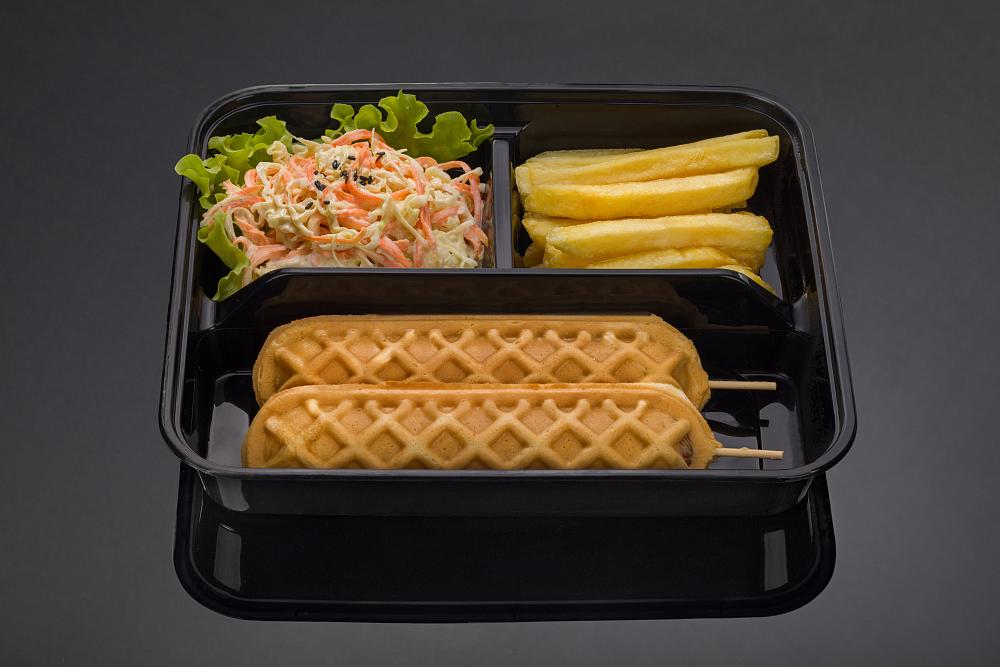 Корн-дог, салат коул слоу (капуста белокочанная, морковь, соус медово-горчичный, соль, кунжут, картофель фри, салатный лист, кетчуп + яблочный сок (250 мл).