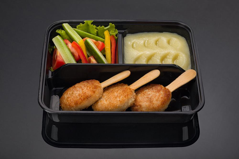 Котлеты куриные на палочке, картофельное пюре, огурцы, помидоры, перец болгарский, латук, кетчуп + яблочный сок (250 мл).