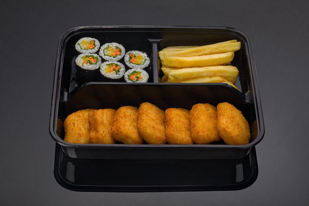 Наггетсы (куриное филе, сыр, сухари панировочные), картофель фри, ролл овощной, лист салата, кетчуп, соус соевый + яблочный сок (250 мл.)