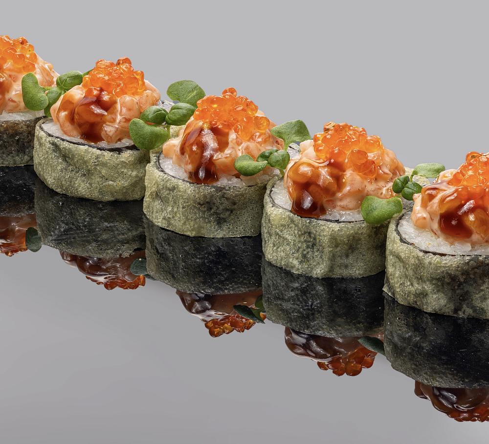 Рис, нори, сыр творожный, авокадо, омлет, редька маринованная тэкуан, огурцы, мука, лосось, соус ментаико, красная икра, микрозелень базилик, соус унаги, кляр темпурный