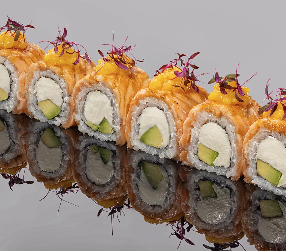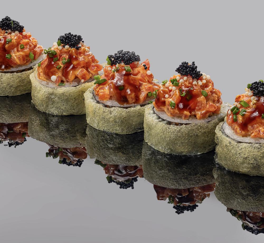 Ролл Филадельфия с огурцом, хрустящий ролл из лосося с жареным луком, тобико и кунжутом юдзу, Ролл из лосося с сыром Филадельфия и луком сибулет, ролл из тунца Еллоуфин с тобико и ореховым соусом, ролл из сибаса с трюфельным соусом и перцем чили