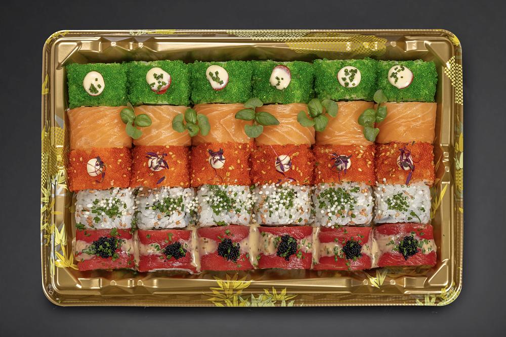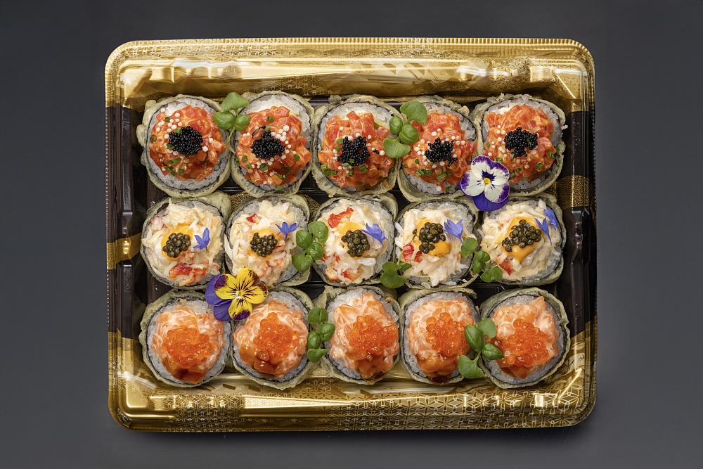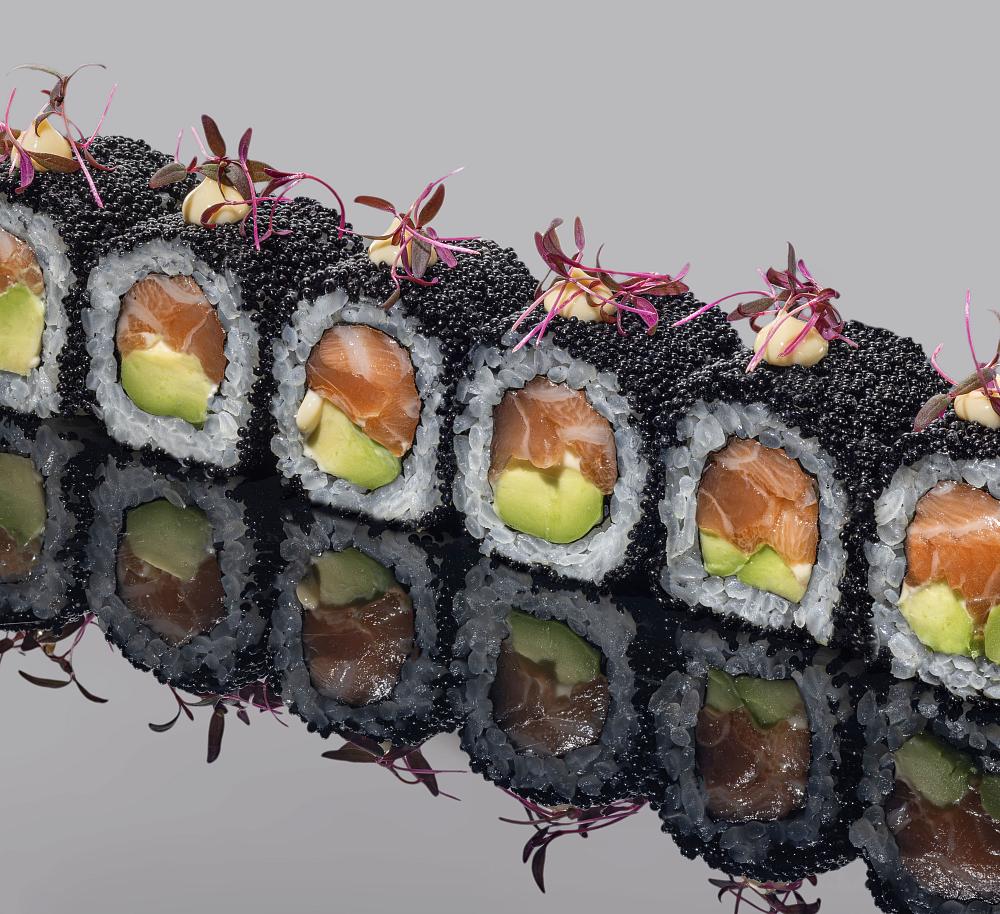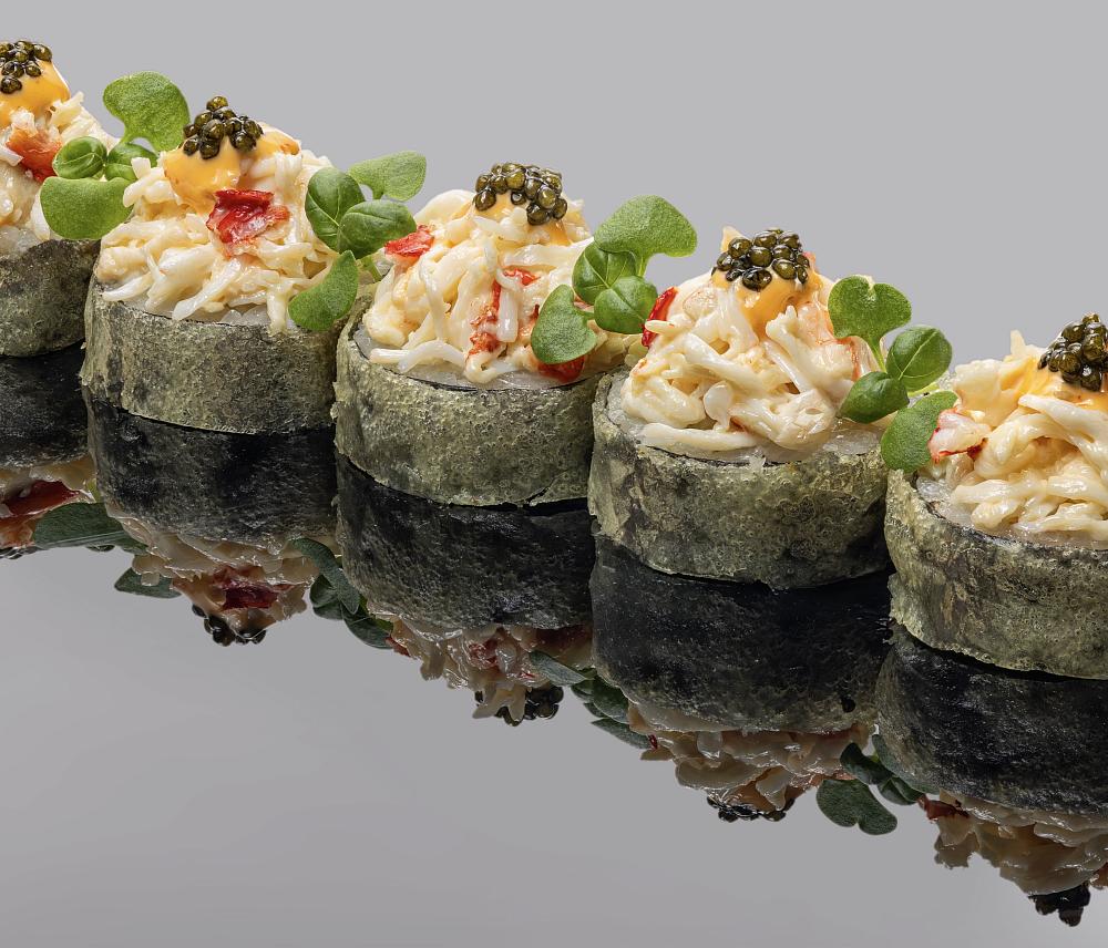 Рис, нори, сыр творожный, авокадо, омлет, редька маринованная тэкуан, огурцы, мука, краб камчатский, майонез трюфельный, соус спайси, черная икра, микрозелень базилик, соус унаги, кляр темпурный