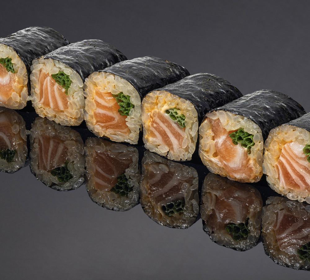 Рис, нори, лосось, авокадо, майонез, икра летучей рыбы, микрозелень амарант