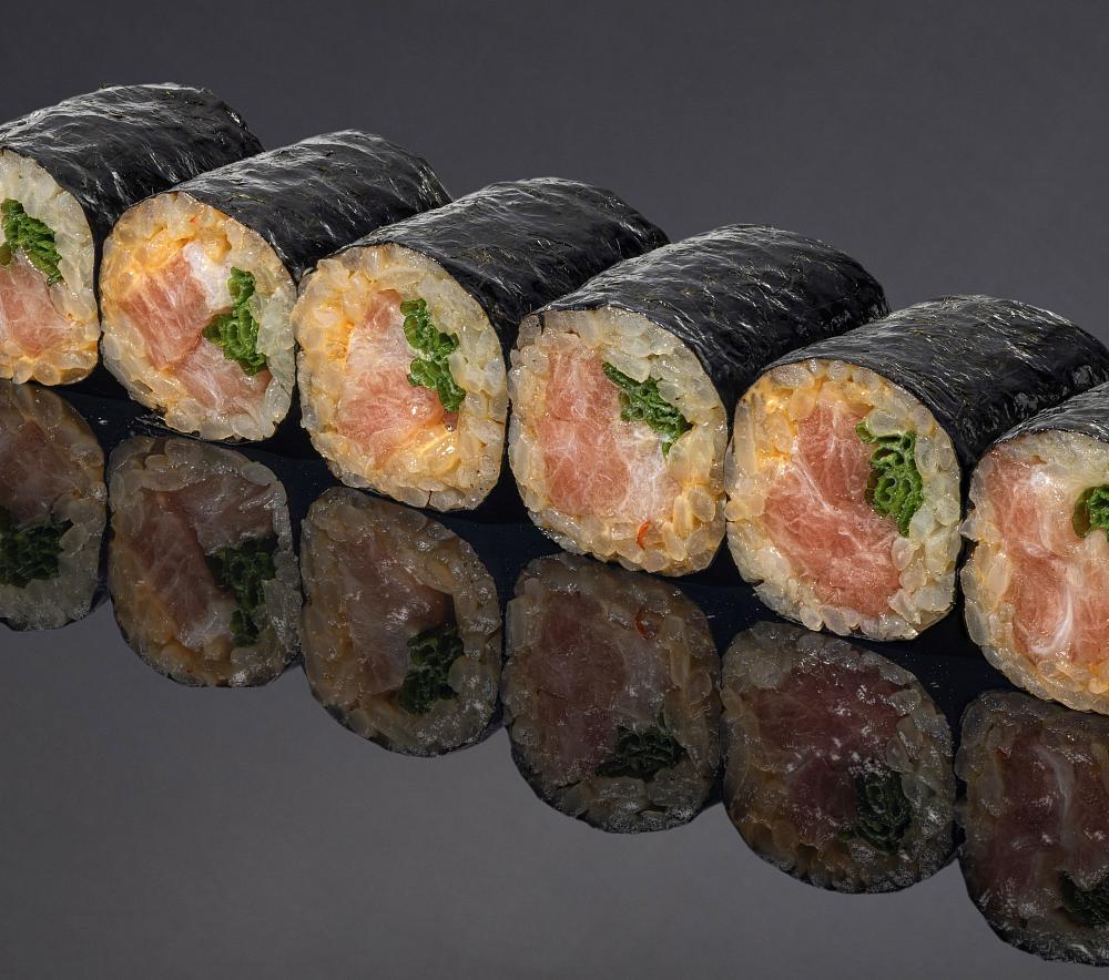 Рис, нори, тунец о-торо, лук-сибулет, соус спайси