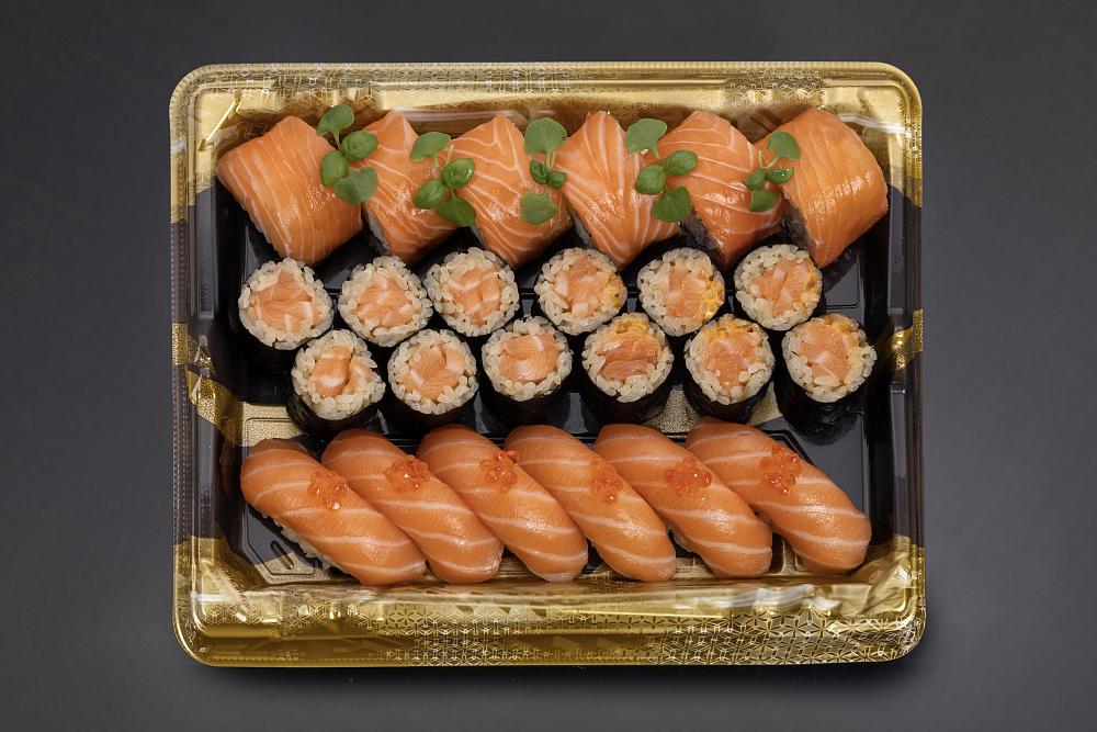 Ролл "Филадельфия" с огурцом, Ролл с лососем, Ролл с лососем в остром соусе, Суши Лосось (6 шт.)