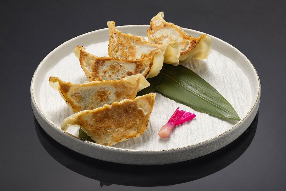 говядина вагю, капуста пекинская, лук зеленый, шпинат, помидоры вяленые, тесто для гедза, маринованный росток имбиря, соус гёдза (5 шт).