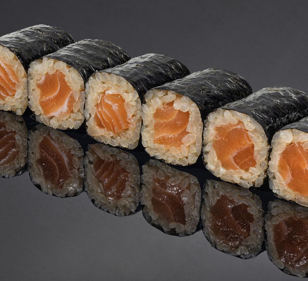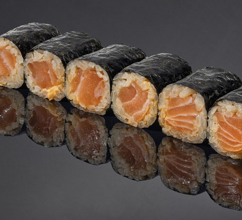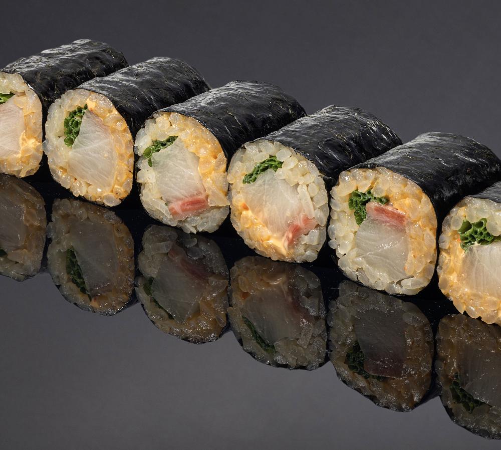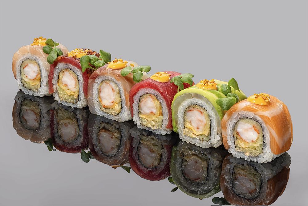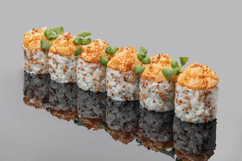 рис для суши, лосось, икра летучей рыбы, майонез японский, кляр жареный, кунжут юдзу, нори, микрозелень
