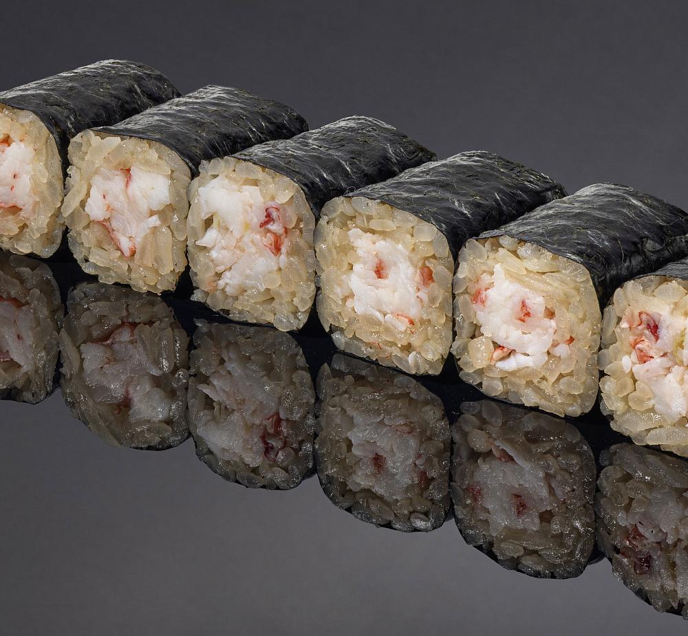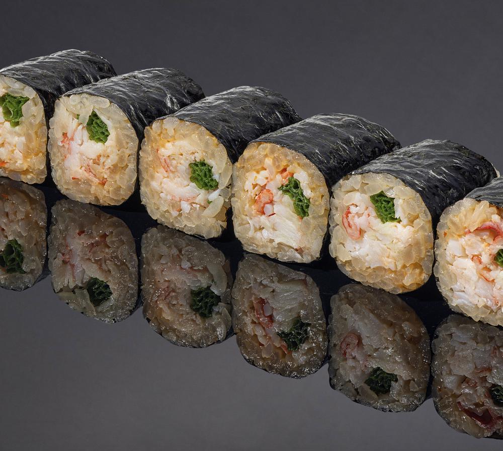 рис для суши, краб камчатский, авокадо, маменори в кунжуте, соус пряно-кремовый
