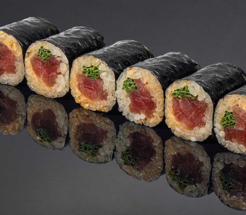 рис для суши, тунец блюфин, икра летучей рыбы, микрозелень, соус спайси, кунжут юдзу, нори