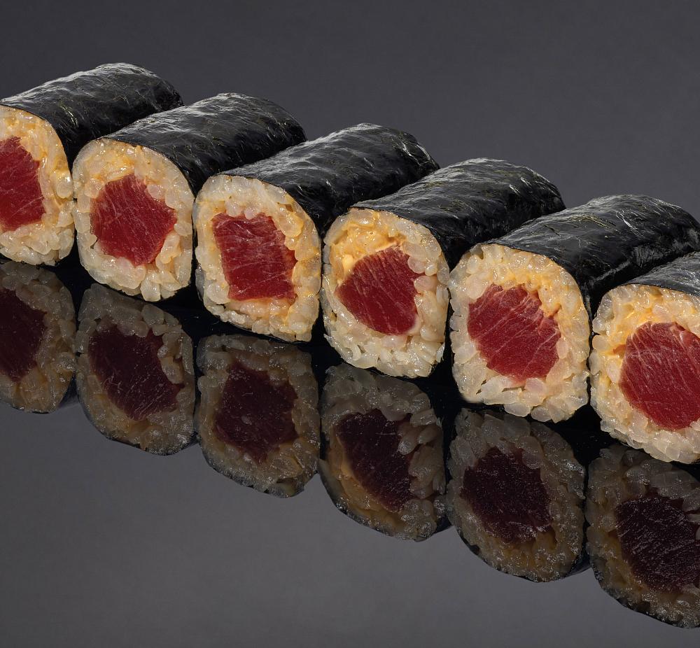 рис для суши, тунец еллоуфин, икра летучей рыбы, соус спайси, кунжут юдзу, нори