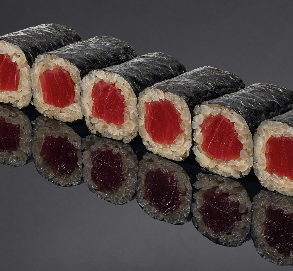 рис для суши, тунец еллоуфин, камчатский краб, креветки тигровые, авокадо, манго, клубника, майонез японский, нори, базилик, микрозелень