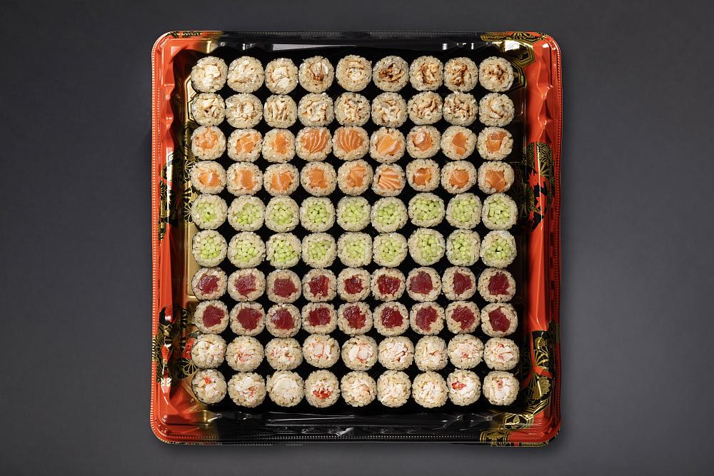 ролл сашими из лакедры, японского омлета и маринованных овощей (1 шт.); ролл сашими из лосося с авокадо, шпинатом и сыром филадельфия (1 шт.); ролл сашими из лосося с манго, авокадо и маринованными овощами (1 шт.); ролл сашими из тунца еллоуфин с манго, спаржей и ореховым соусом (1 шт.); ролл сашими с тунцом еллоуфин, лососем и авокадо (1 шт.)
