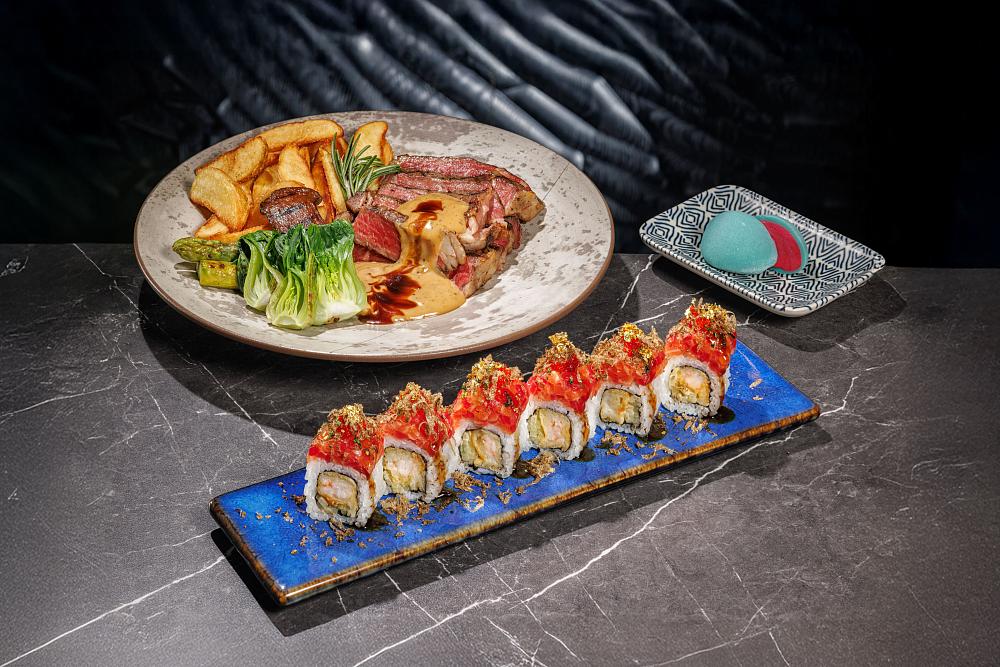 Ролл из лосося, тунца; креветки темпура с трюфелем, рибай со спаржей, салатом пак чой сливочно-перечным соусом, моти малина